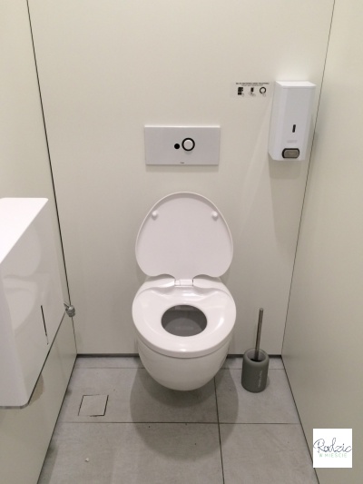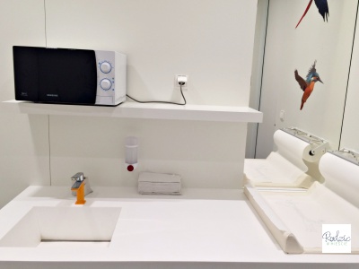 Toalety z przewijakami dostępne są na każdym piętrze. Są bardzo dobrze przygotowane. Do pokoju dla rodziców z dzieckiem można spokojnie wjechać wózkiem, a w środku znajdziemy pełne wyposażenie: toaletę (co pozwala na skorzystanie również rodzicowi) z deską zaprojektowana tak, aby maluch mógł na niej swobodnie usiąść, przewijak wraz z jednorazowymi, papierowymi nakładkami, umywalkę, blat na wyłożenie niezbędnych rzeczy, kosz na pieluchy oraz mikrofalówkę do podgrzania posiłku.