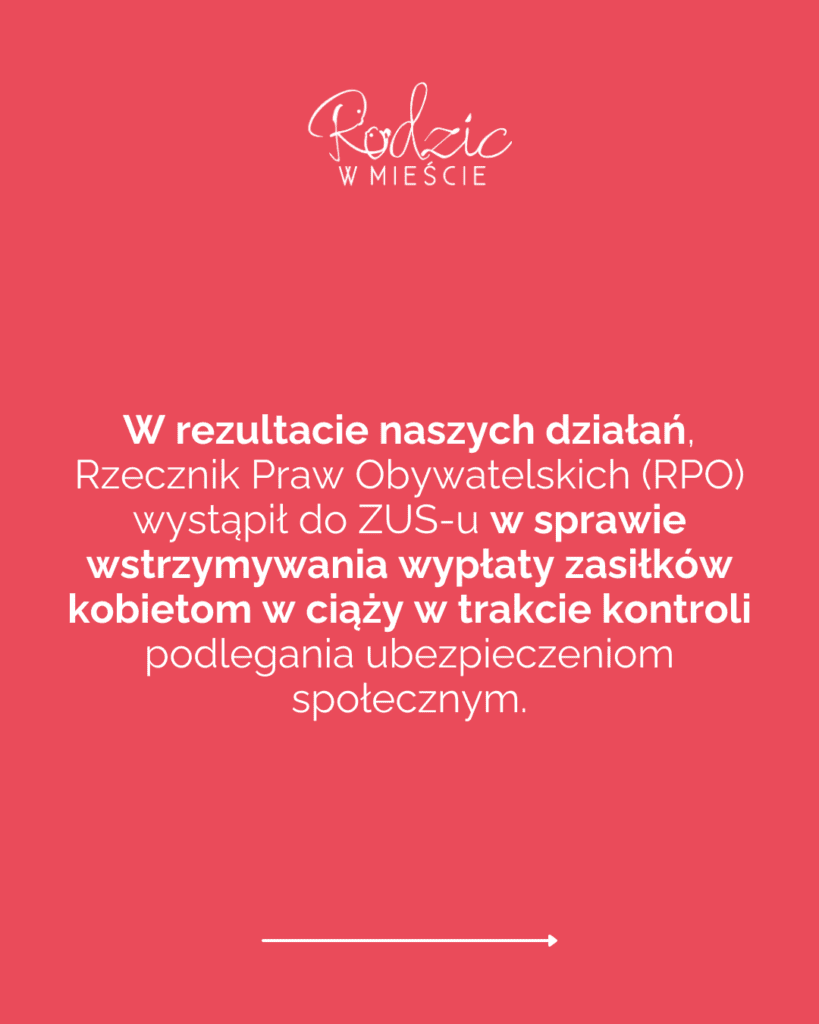 W efekcie naszych nacisków, w listopadzie 2025 roku Rzecznik Praw Obywatelskich wystąpił do Zakładu Ubezpieczeń Społecznych w sprawie wstrzymywania wypłaty świadczeń z ubezpieczenia chorobowego kobietom w ciąży w trakcie kontroli podlegania ubezpieczeniom społecznym.